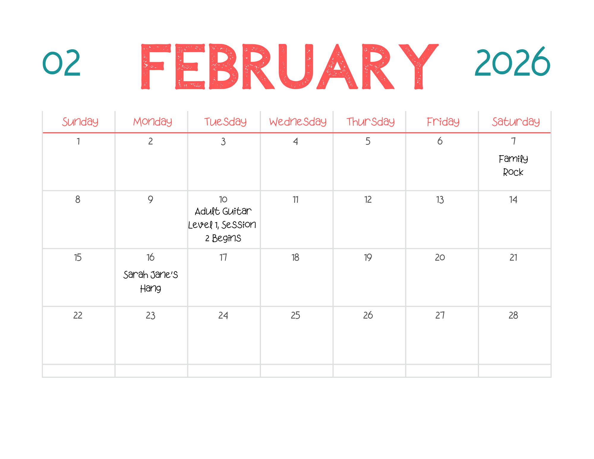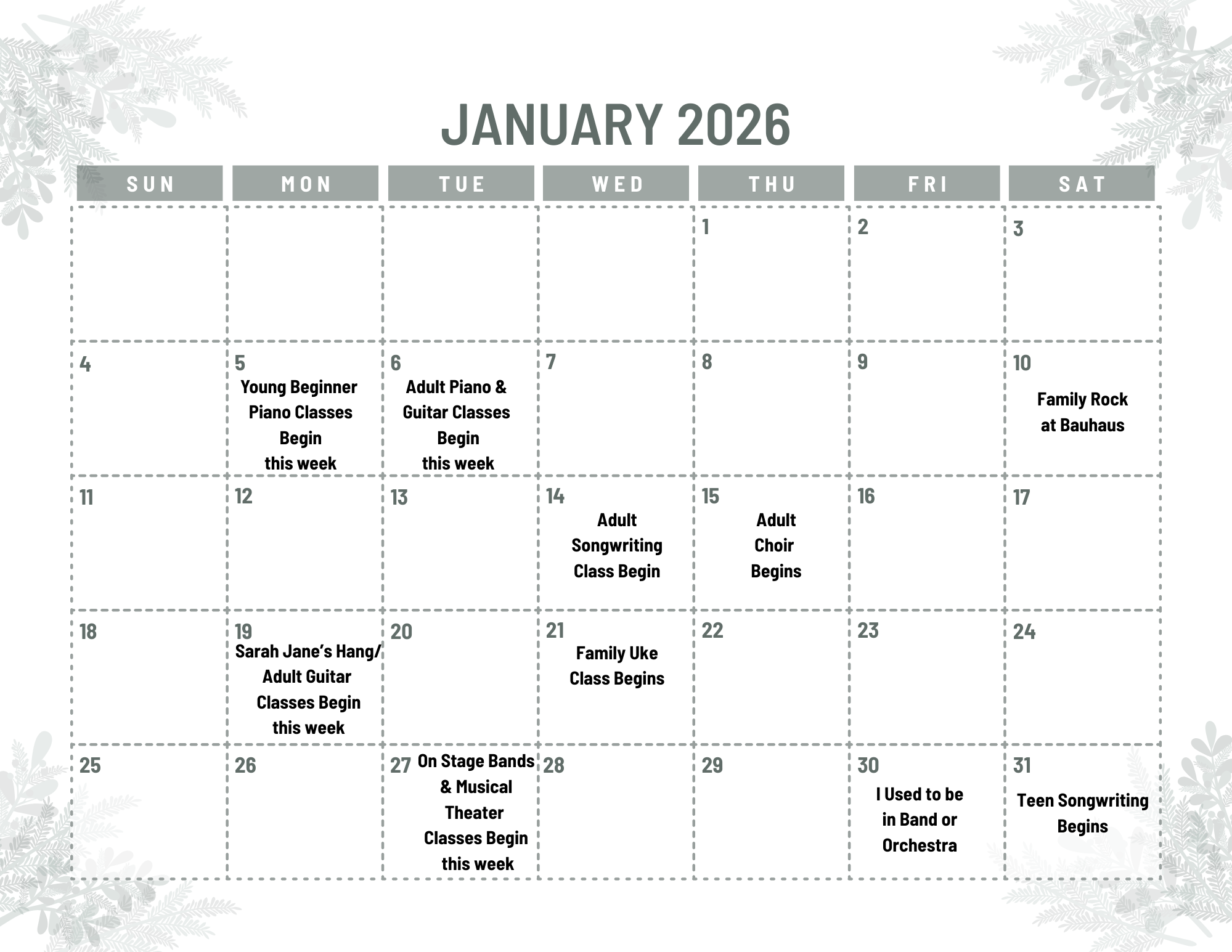 Sarah Jane’s Music School Calendar